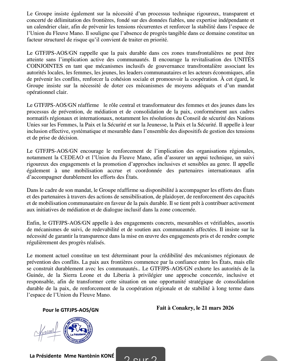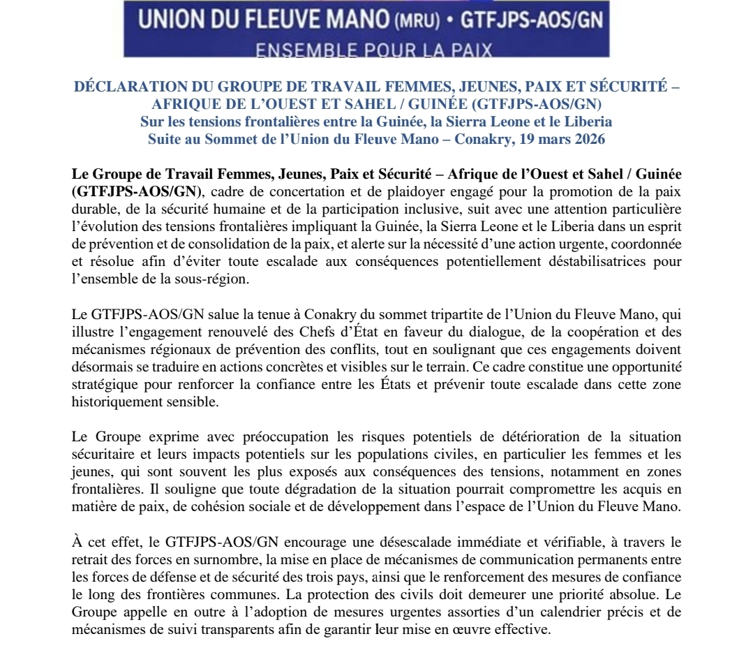 Face aux tensions persistantes aux frontières entre la Guinée, la Sierra Leone et le Liberia, le Groupe de Travail Femmes, Jeunes, Paix et Sécurité – Afrique de l’Ouest et Sahel / Guinée exhorte à des mesures immédiates de désescalade et de dialogue. Saluant les engagements issus du sommet de l’Union du Fleuve Mano à Conakry, il insiste sur la nécessité d’actions concrètes, inclusives et coordonnées pour prévenir toute escalade et préserver la stabilité dans la sous-région.