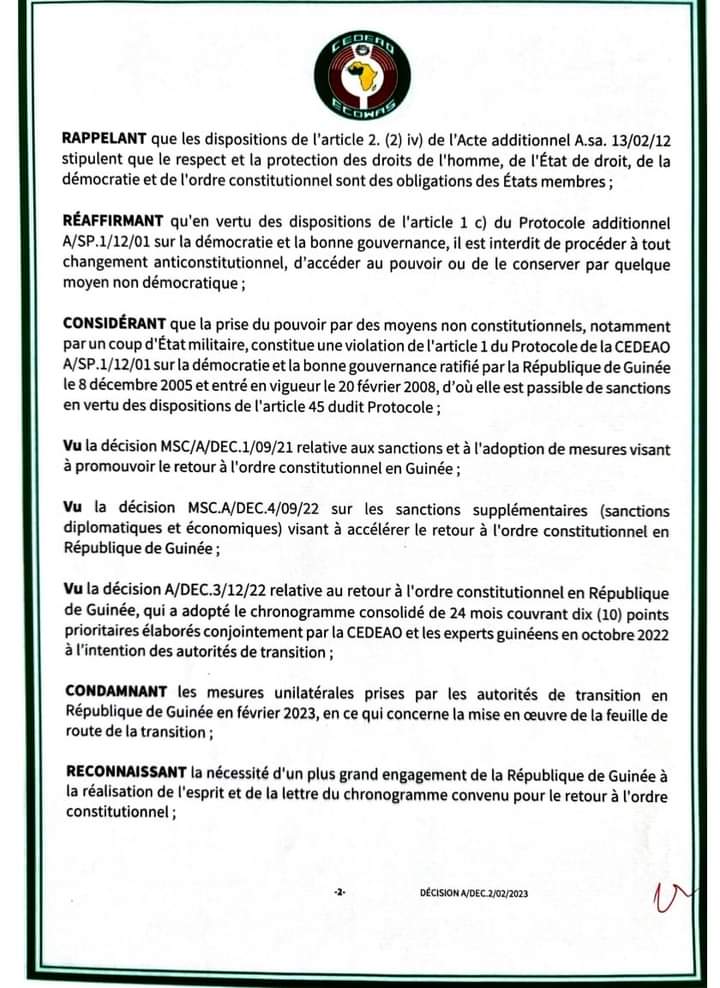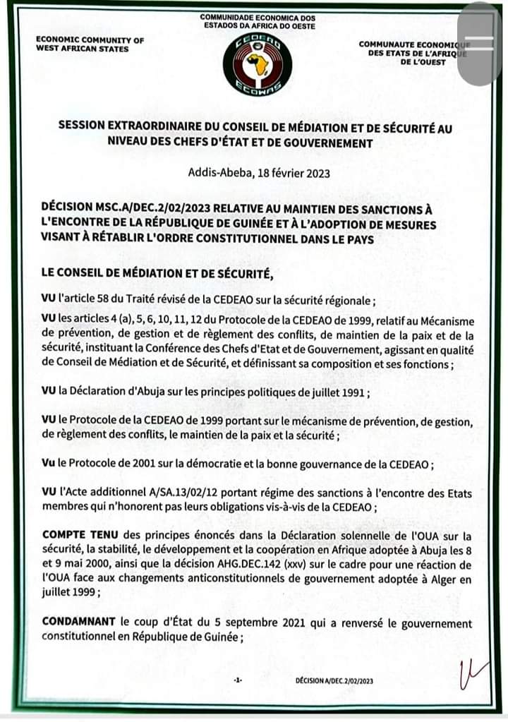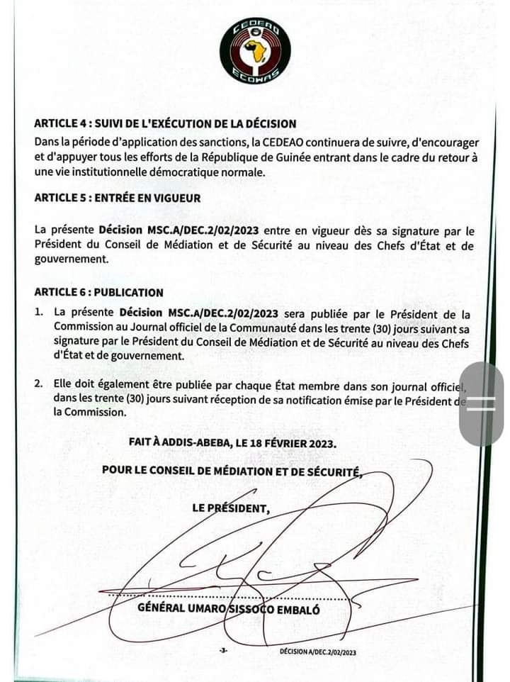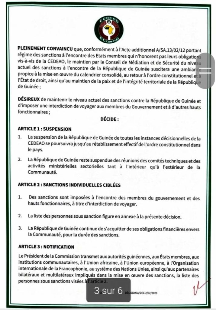 La République de Guinée est également suspendue de toutes les instances décisionnelles de la CEDEAO jusqu’au rétablissement effectif de l’ordre constitutionnel. La Guinée est aussi suspendue des réunions des comités techniques et des activités ministérielles sectorielles tant à l’intérieur qu’à l’extérieur de la communauté.