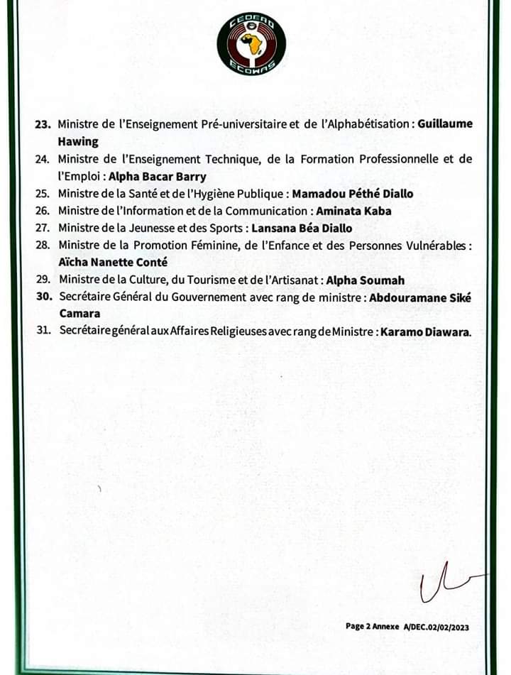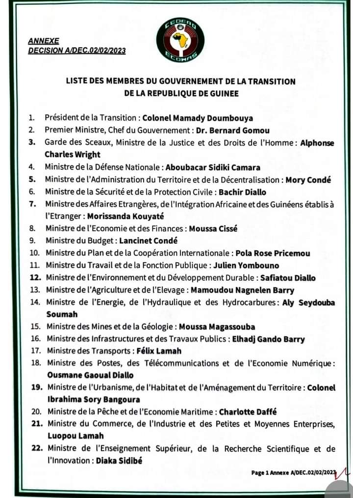 Dans communiqué signé par le président de la conférence des chefs d’Etat, la CEDEAO a communiqué la liste des membres du gouvernement de la transition en Guinée qui font l’objet de sanctions notamment à des interdictions de voyage.