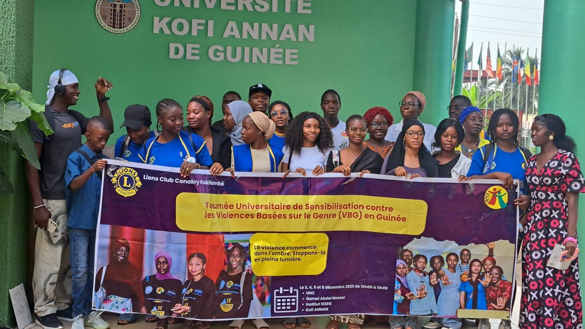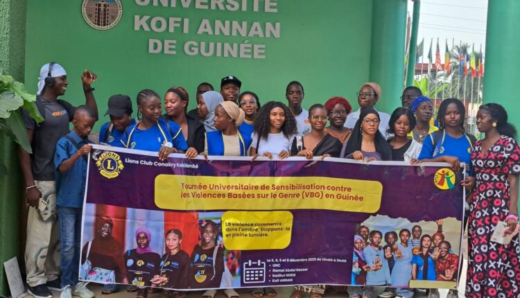 Dans le cadre des 16 jours d’activisme contre les violences basées sur le genre (VBG), le Lions Club Kakilambé, en partenariat avec les Jeunes Filles Leaders de Guinée (CJFLG), a procédé ce dimanche à la clôture de sa tournée universitaire de sensibilisation à l’Université Koffi Annan de Guinée (UKAG). Cette campagne, menée du 3 au 8 décembre, a permis de toucher 631 étudiants(es) et enseignants à travers trois institutions d’enseignement supérieur : 217 à l’UNC, 184 à l’ISSEG et 230 à l’Université Koffi Annan.