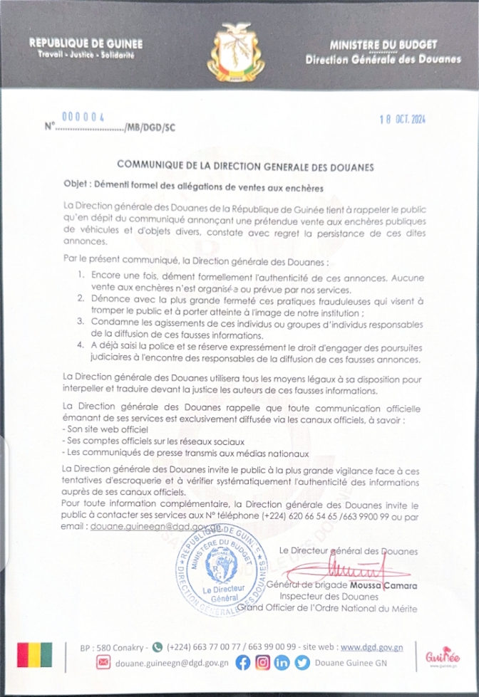 La Direction générale des Douanes de la République de Guinée tient à rappeler le public qu’en dépit du communiqué annonçant une prétendue vente aux enchères publiques de véhicules et d’objets divers, constate avec regret la persistance de ces dites annonces.