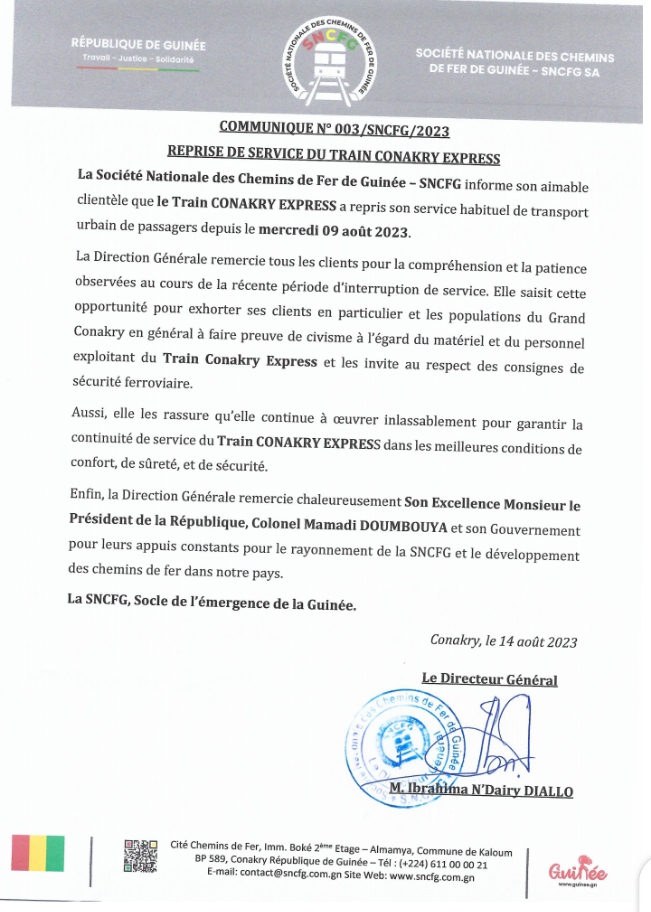 Par la même occasion, la direction générale de la SNCFG remercie tous les clients pour la compréhension et la patience observées au cours de la récente période d’interruption de service. Ci-dessous le communiqué :