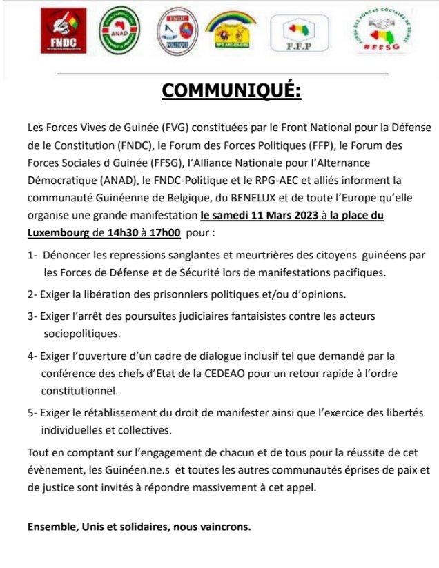 Dans un communiqué envoyé à notre rédaction, les forces vives de Guinée (FVG) annoncent une grande manifestation le samedi 11 mars 2023 à la place du Luxembourg de 14h à 17h 00.