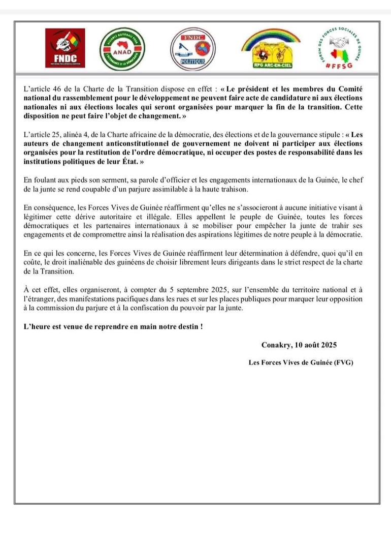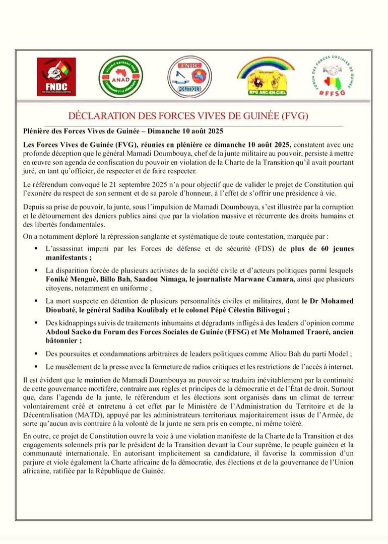 Réunies en plénière le 10 août 2025, les Forces Vives de Guinée (FVG) dénoncent le référendum du 21 septembre, qu’elles qualifient de manœuvre visant à offrir au général Mamadi Doumbouya une présidence à vie. Elles annoncent une série de manifestations à partir du 5 septembre pour s’opposer à ce qu’elles considèrent comme un « parjure » et une « haute trahison » contre la Charte de la Transition.