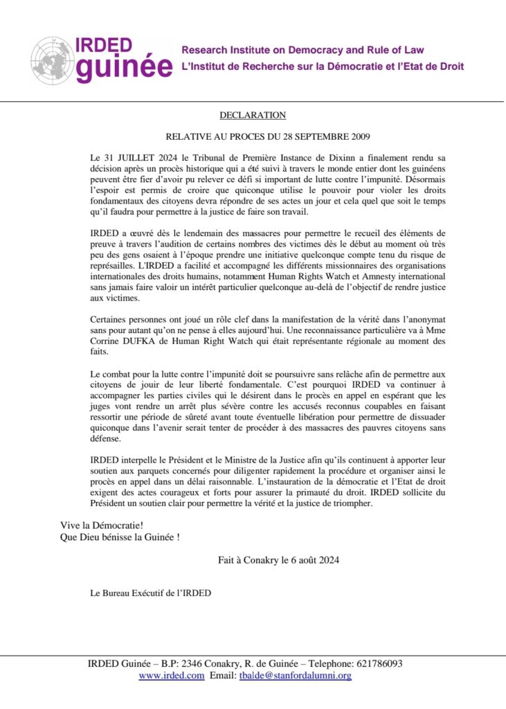 Le 31 juillet 2024, le Tribunal de Première Instance de Dixinn a rendu sa décision dans le procès tant attendu des événements tragiques du 28 septembre 2009. L’Institut de Recherche sur la Démocratie et l’État de Droit (IRDED) se félicite de cette avancée historique pour la justice et les droits humains en Guinée.