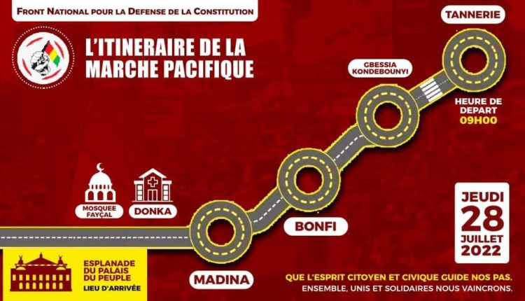 Le comité d’organisation de la marche citoyenne et pacifique du Jeudi 28 Juillet 2022, informe que la marche citoyenne pacifique pour le retour à l’ordre constitutionnel partira du Rond-point de la Tannerie au Palais du peuple où les discours seront prononcés pour interpeller les autorités de la transition sur la nécessité pour notre pays de renouer avec l’ordre constitutionnel normal, afin que la Guinée soit un pays démocratique et vertueux.