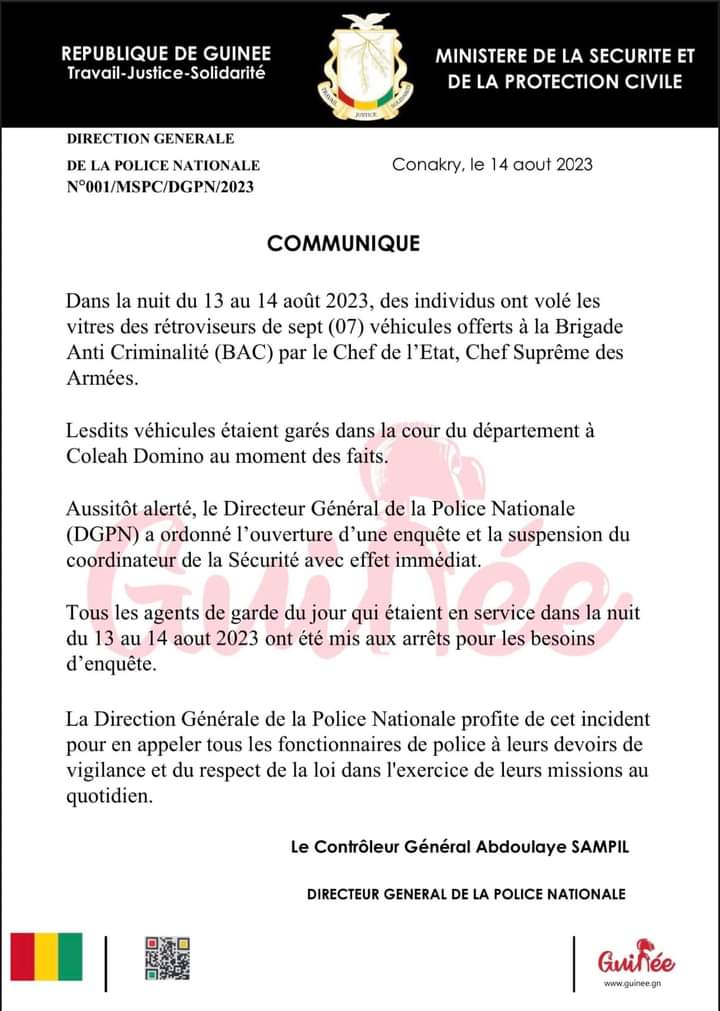 Dans cette même communication, le ministère de la sécurité et de la protection civile indique que tous les agents de garde du jour qui étaient en service dans la nuit du 13 au 14 aout ont été arrêtés pour des besoins d’enquête. Ci-dessous le communiqué :